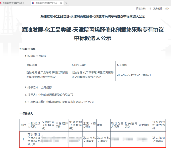 江華環(huán)保中標中海油丙烯醛催化劑載體采購項目