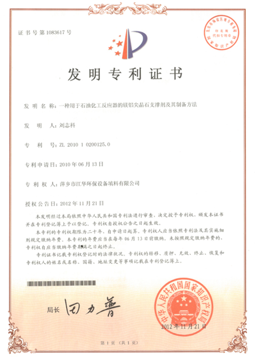 鎂鋁尖晶石支撐劑自主產(chǎn)權發(fā)明專利證書