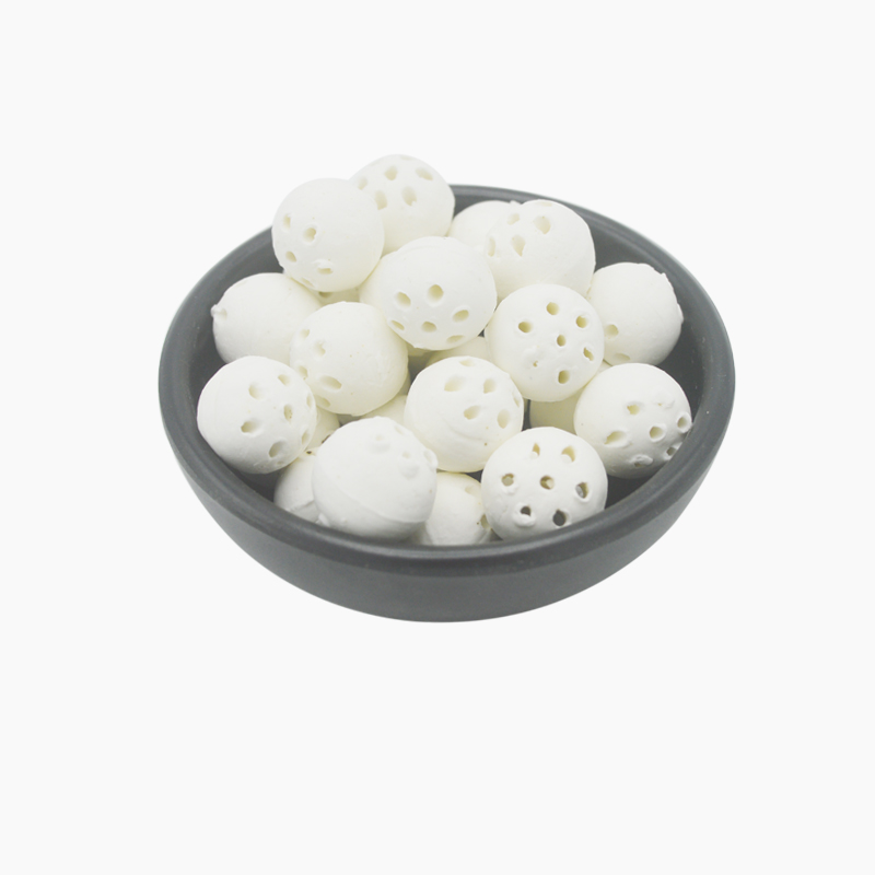 開孔瓷球外觀為白色球體,開孔互相垂直,開孔數(shù)量可以根據(jù)實(shí)際使用需要和瓷球的尺寸大小開單孔、三孔、五孔及七孔。