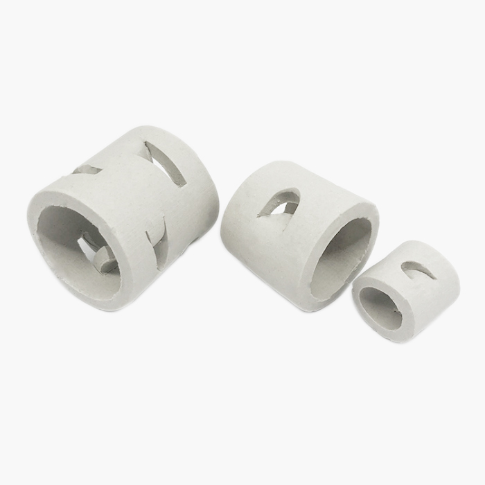 陶瓷鮑爾環(huán)填料是在陶瓷拉西環(huán)的基礎上開發(fā)的一種高徑相等的開孔環(huán)型填料,每層窗孔有5個舌葉,每個舌葉內彎指向環(huán)心,上下兩層窗孔的位置相反錯開,一般開孔面積約占環(huán)壁總面積的30%左右,使得填料塔內的氣體和液體能夠從窗孔自由通過,改善了氣液分布,充分利用了環(huán)的內表面。