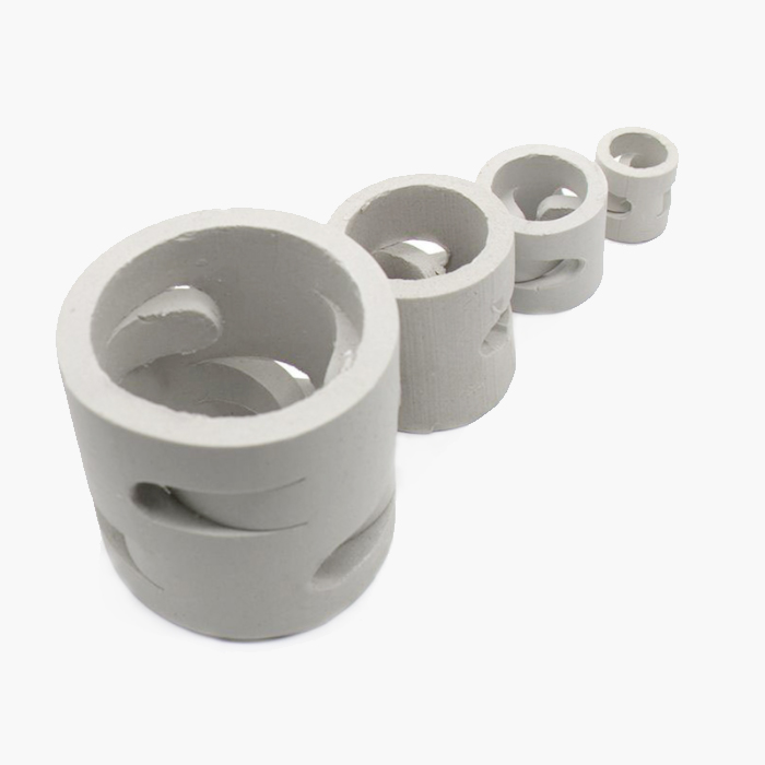 陶瓷鮑爾環(huán)填料是一種高徑相等的開孔型填料,每層窗孔有5個舌葉,每個舌葉內(nèi)彎指向環(huán)心,上下兩層窗孔的位置相反錯開,一般開孔面積約占環(huán)壁總面積的30%左右。這種結(jié)構(gòu)改善了汽液分布,充分利用了環(huán)的內(nèi)表面,從而使得填料塔內(nèi)的氣體和液體能夠從窗體自由通過。
