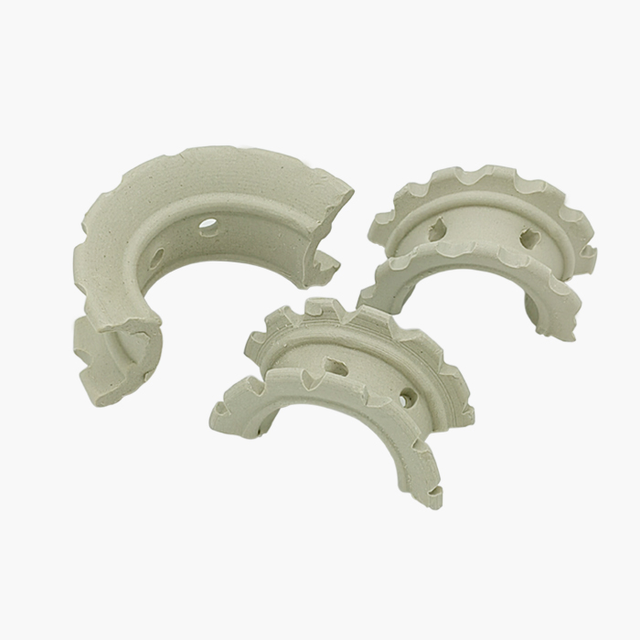 陶瓷異鞍環(huán)填料是在矩鞍環(huán)填料的基礎(chǔ)上加以改進(jìn)的新型填料,將矩鞍填料的平滑弧形側(cè)面改為鋸齒形或紋紋凸起的側(cè)面。這樣在填料床層內(nèi),增加了填料間接觸的空隙,使之更有利于氣體和液體在填料層中的流動和擴(kuò)散。