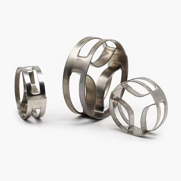 金屬扁環(huán)填料是一種短開孔環(huán)型填料。其高、徑比達到大約1/3,扁環(huán)填料在結(jié)構(gòu)上與階梯環(huán)相似,取消了階梯環(huán)的翻邊,采用內(nèi)彎弧形筋片來提高填料強度,在亂堆時能有序排列,流道結(jié)構(gòu)合理,壓降低,在處理能力和傳質(zhì)性能上均有所改善。確保填料堆積時統(tǒng)一朝向,增加了堆密度,內(nèi)彎弧筋片使填料層內(nèi)氣液分布更加 均勻,大大提高了分離效果,具有傳質(zhì)交率高、床層阻力低、自理能力大、返混夾帶小、不易結(jié)垢等優(yōu)點。